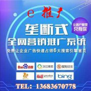 e快推全網(wǎng)推廣系統(tǒng)為您解決不會(huì)做,做不好,沒人做的難題 搜索營銷推廣 主流搜索引擎,占領(lǐng)電腦端,手機(jī)端,iPad端,快速獲取關(guān)鍵詞排名 站群推廣節(jié)流 系統(tǒng)每天在高權(quán)重媒體上為企業(yè)生...